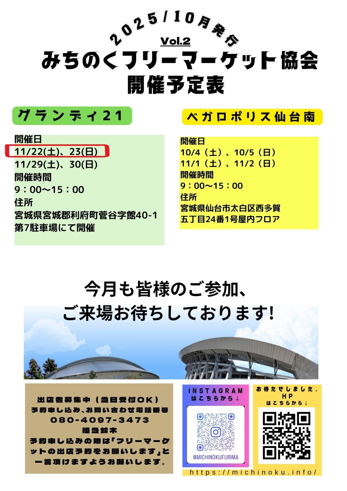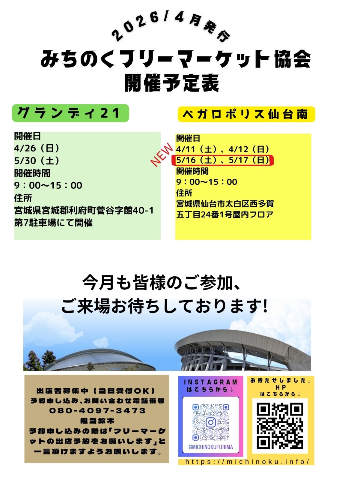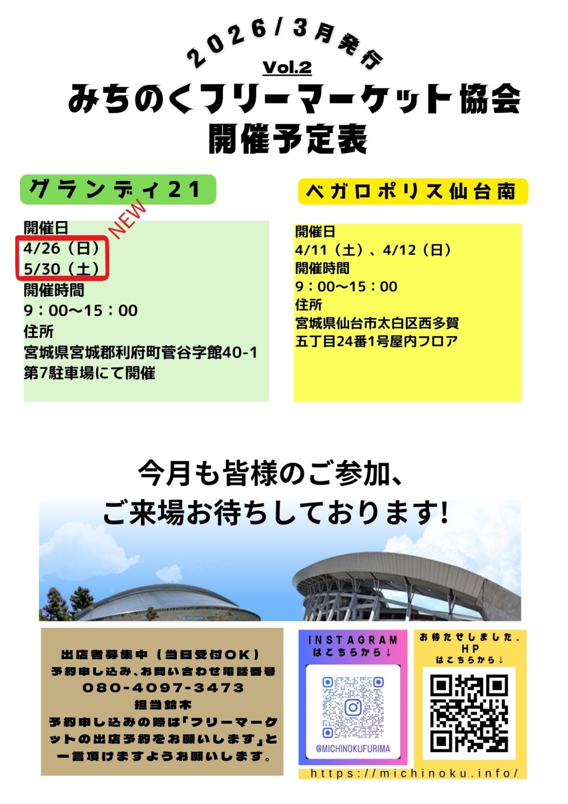 宮城県総合運動場「グランディ21」でのフリーマーケット開催!「グランディ21」でお得なお買物はいかがでしょうか? 洋服・雑貨・手作りアクセサリーなど様々な種類の商品から掘り出し物が見つかるかも!?